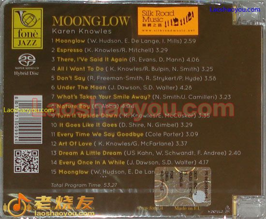 她的专辑【月光(Moonglow)】是她与发烧皇牌’fone’的首次合作,她使出浑身解数,情深地演绎她15首首本名曲包括【Moonglow(月光)】、【Espresso(浓咖啡)】、【All I Want to Do(我只想这样做)】、【Don’t Say(不要说)】、【Under The Moon(在月亮下)】、【Nature Boy(自然孩童)】、【Turn It Upside Down(打倒转)】、【It Goes Like It Goes(就是如此)】、【Art of Love(爱的艺术)】和【Dream A Little Dream(小小梦儿)】等,每首乐曲她都发挥得淋漓尽致,尽显其出眾的音乐才华,加上由国际知名的录音师里兹(Giulio Cesare Ricci)亲自监製,採用最极级的器材灌录, 配以SACD為载体,空间感十足,使你如置身现场,更能令你融入悠扬乐韵之中。